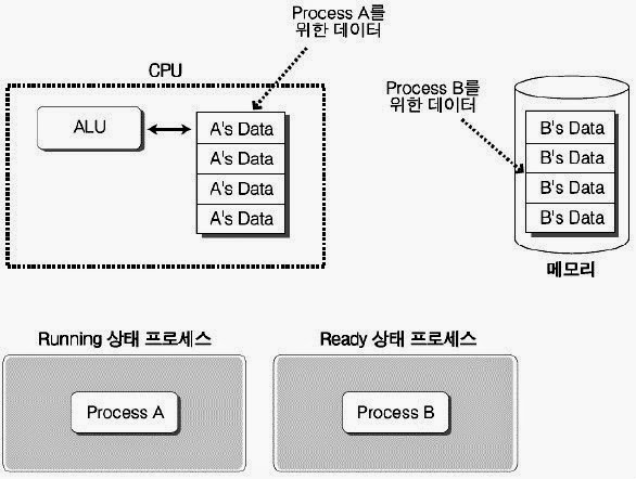 프로세스 A와 B가 존재한다. A가 running, B는 ready 상태이다. 이 때 어떤 이유로 A가 ready, B가 running 상태가 되는 경우가 곧 발생할 것이다. 먼저 실행 중인 A에 대한 데이터는 현재 레지스터에 존재할 것이다. 그리고 ready 상태인 B는 메모리에 존재할 것이다. 하지만 이제 B가 실행되어야 하기 때문에 A는 레지스터를 B에 양보해주어야 한다. 그리고 A에 대한 데이터는 어떻게 해야할까? 그냥 버리면 될까? 아니다. A에 대한 데이터는 B가 실행을 마친 후에 A가 실행될 수 있으므로 계속 가지고 있어야 한다. 즉, 현재 레지스터에 존재하는 A에 대한 데이터는 메모리에 저장되어야 한다.